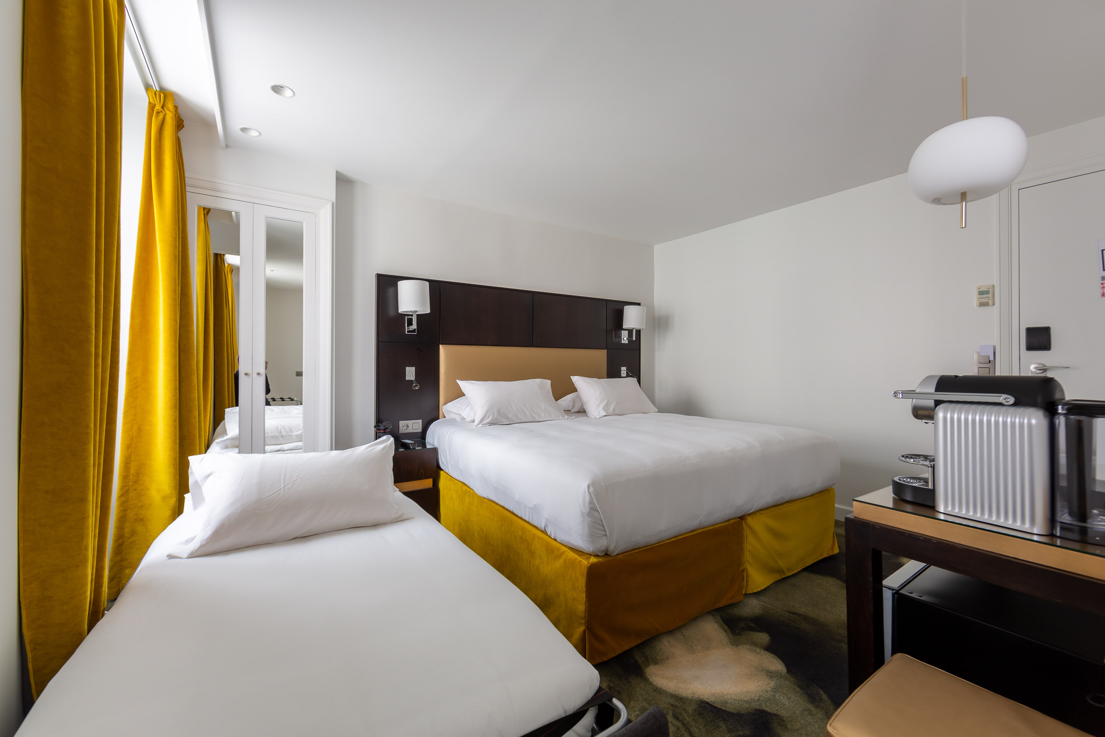 Each triple room of our 4-star hotel is non-smoking, and has heating and air conditioning, double glazed windows facing the street from the 1st to the 3rd floor of our establishment. The private bathroom has a full bath, there are two beds (90 x 190cm) and a convertible lounge chair with a mattress (90 x 190cm) with high quality linens, where you can rest well throughout your stay in Paris. The triple room can welcome up to three persons, suitable for families or friends.